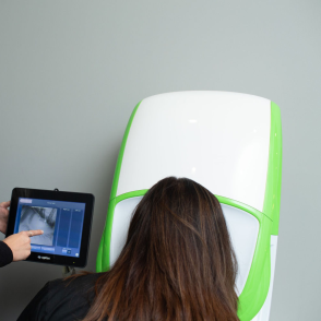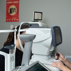 The room pictured to the left is called our pretesting room. Our technicians obtain preliminary data here before taking you to one of our four examination rooms. The green and white instrument is the Optomap (click link for a much more detailed explanation).